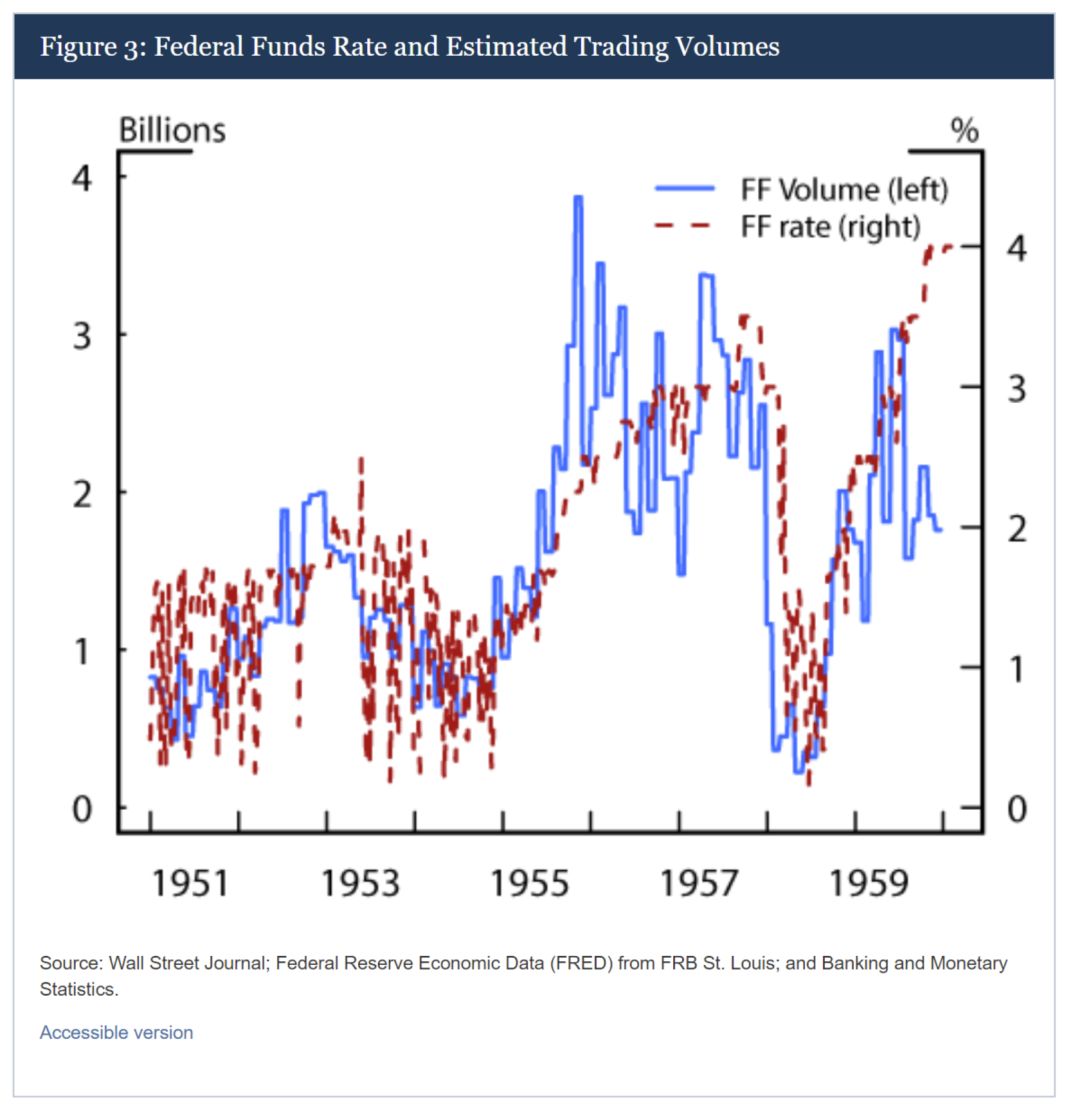 随着银行越来越需要在货币紧缩的情况下管理其流动性,联邦基金市场的交易逐渐复苏。通过这一经验,联邦基金市场的规模和流动性状况变得自我强化;随着市场的发展,它吸引了更多的参与者,进一步提高了其在管理流动性方面的实用性。这一历史经验可能对当前的货币政策产生影响,因为它表明,随着美联储通过收紧货币政策减少准备金供应,以及作为参与市场回报的动力,联邦基金市场的银行间交易最终可能复苏。