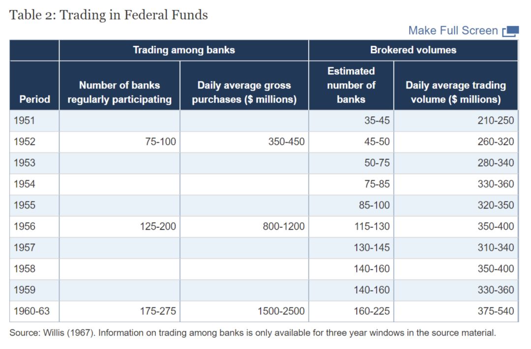 其他研究者对市场的描述强化了这样一种观点,即更活跃的市场带来了更多的参与者,这进一步推动了市场活动和流动性。首先,Willis(1972)报告说,在20世纪50年代,市场结构从银行间的联邦资金直接交换(银行-银行)变为通过经纪商(银行-经纪商-银行)的交换,导致交易量显着增加,交易对手数量增加(见表2)。另有三家机构在20世纪50年代后期作为联邦基金经纪商进入市场。此外,一些大型银行开始在市场的两边积极交易做市。其次,随着更多的经纪商和交易银行的进入,市场上的最小交易规模下降,小型国家银行能够在市场上进行交易。